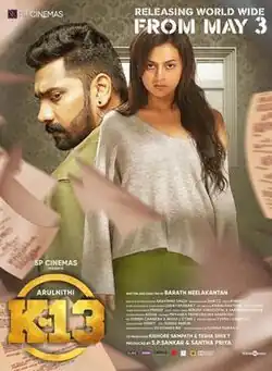 K-13 (also spelt K13) is a 2019 Indian Tamil-language psychological mystery film[2] written and directed by Barath Neelakantan in his directorial debut. The film stars Arulnithi and Shraddha Srinath, while Gayathrie, Yogi Babu, and Ramesh Thilak play supporting roles.[3] Sam C. S. has been hired as music composer for the film replacing initially speculated music director turned actor Darbuka Siva due to the latter's acting and directorial commitments and aspirations. The film was released on 3 May 2019 to positive reviews but become an average hit.[4]