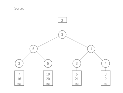 The algorithm is initiated with the heads of each input list. Using these elements, a binary tree of losers is built. For merging, the lowest list element 2 is determined by looking at the overall minimum element at the top of the tree. That value is then popped off, and its leaf is refilled with 7, the next value in the input list. The games on the way to the top are replayed like in the previous section about replacement selection. The next element that is removed is 3. Starting from the next value in the list, 6, the games are replayed up until the root. This is being repeated until the minimum of the tree equals infinity.