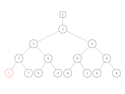 2 | Replaying the game 9 vs 7 (previous loser). 7 wins because it is smaller. Therefore, 7 is promoted to the top while 9 is saved in the node. |