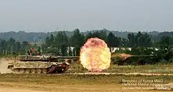 From January 2003 to 2007, a number of test vehicles were built: two test vehicles, the MTR (Mobility Test Rig) and FTR (Firepower Test Rig), and three PV (Pilot Vehicles) were built to demonstrate technology and performance. MTR and FTR conducted mobility, fire control, combat control, and low temperature operating life tests, while PV1, PV2, and PV3 conducted tests on endurance, developer, operator, and integrated logistics support.[18] The last prototype was unveiled on 2 March 2007 at the proving ground in Changwon,[20][21] and the development was officially completed after being declared fit for combat by the Defense Acquisition Program Administration (DAPA) in September 2008. The XK2 development project, which began in 1995 and ended in 2008, cost a total of 452.6 billion won spread over 14 years.[22] The K2 tank began to be called the Black Panther for its speed and valiance.[23]