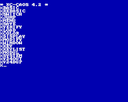 The KC 85 could be programmed in assembly language and BASIC (the KC 85/2 had to load BASIC from tape), but it was possible to use various modules (sold by VEB Mikroelektronik Mühlhausen) or load software from tape, thus allowing programming in Forth and Pascal. The operating system was CAOS ("Cassette Aided Operating System"). It was a simple monitor where one could run different "system services" like LOAD (load a program), JUMP (into extension module ROM), MODIFY (memory cells) or BASIC (if it had been built into the ROM or had been loaded from tape). New commands could be added to the menu by magic numbers (standard: 7F 7F 'commandname' 01