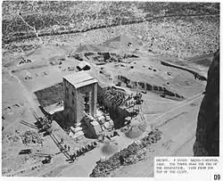 The Naqsh-e Rustam compound was first investigated and probed along with the Ka'ba-ye Zartosht structure by Ernst Herzfeld in 1923.[11] Additionally, the compound was probed by the Oriental Institute of the University of Chicago under the leadership of Erich Schmidt in several seasons between 1936 and 1939, finding important works like the Middle Persian version of the Great Inscription of Shapur I, which was written on the wall of the structure.[11]