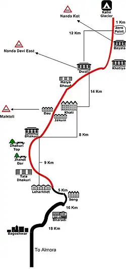 The glacier is located in Bageshwar district. From Bageshwar town it can be approached via route of Bharadi, Saung, Loharkhet, Dhakuri Pass, Khati, Dwali and Khatiya. The route until Loharkhet is motorable, after which it is approximately a 90 km (56 mi) round trip. Khati is the last village on the route. Though Pindari is more popular tourist destination, some people find route to this glacier more beautiful. Unlike Pindari, tourists can trek up to the glacier. In case of Pindari, the trek beyond zero point becomes very tough and cannot be done without proper equipment.