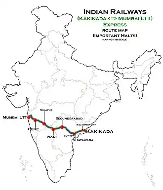 The 17221 / 22 Kakinada Port–Lokmanya Tilak Terminus Express runs from Kakinada Port via Samalkot Junction, Rajahmundry, Tadepalligudem, Eluru, Vijayawada Junction, Mangalagiri, Guntur Junction, Sattenapalli, Nadikude Junction, Miriyalaguda, Nalgonda, Moula Ali, Secunderabad Junction, Lingampalli, Tandur, Wadi Junction, Gulbarga, Solapur, Pune Junction, Lonavala to Lokmanya Tilak Terminus.[5]