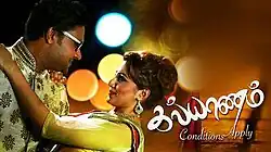 Kalyanam (Tamil: கல்யாணம்) is a 2016 Singaporean soap opera starring Karthikeyan Somasundram, Nithya Shree, Jaynesh and Eswari Gunasagar. It was created by I.Sundar[1] and is executively produced by Megastar Production's 'V.Kalaiselvan and Susiilaa Shanmugam. With Production Managed by Shasirekka Rountan and Lavin Selvan. It aired on Mediacorp Vasantham from 4 April 2016 to 23 June 2016, on Monday through Thursday at 10:00 pm SST for 45 episodes.