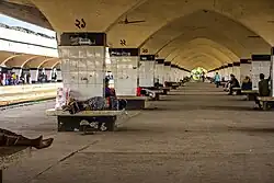 According to the statistics of 2014, the number of homeless people in Dhaka is at least 7 thousand. Many of them live in Kamalapur railway station because of lack of means. Today it is one of the refuges of the destitute population in the city.[70] This unguarded railway station building is the target of criminal activities of vagrants. According to the information of the detective branch, various criminals are waiting to commit misdeeds at this railway terminal and hence the station is dangerous for passengers. According to Railway Police data, 86 criminals were arrested from the terminal in 2021.[71] This is also a safe place for drug dealers.[72] In 2022, Newsbangla24.com reported that there is a lack of security at the terminal and a lack of police personnel can be seen after the evening. The reporter saw some people taking drugs in public and interviewed a porter who was there revealed that the policemen are removed after 12:00 am. On the other hand, the railway police authority blamed the lack of manpower for this insecurity in the station.[73]
