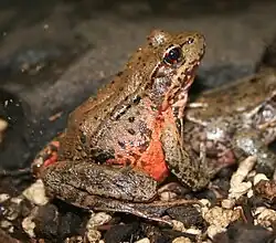 Under the Forest and Range Practices Act, the coastal tailed frog, northern red-legged frog, and Pacific water shrew are considered 'species at risk' and are all found in the park.[11] Both the coastal tailed frog and the northern red-legged frog can be found in shaded small, slow streams. Their habitats are regularly disturbed by forest harvesting and road construction. The Pacific water shrew can be found in forests along slow-moving streams however the species is endangered and considered extremely rare. This shrew species is affected by any disturbances in its wetland habitat.[11] Under the Conservation Status Rank List of British Columbia, the northern red-legged frog is on the Blue List (species of special concern), the coastal tailed frog is on the Yellow List (least risk of being lost), and the Pacific water shrew is on the Red List (risk of being lost).[12][13]