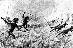 The kangaroo has always been a very important animal for Aboriginal Australians, for its meat, hide, bone, and tendon. Kangaroo hides were also sometimes used for recreation; in particular there are accounts of some tribes (Kurnai) using stuffed kangaroo scrotum as a ball for the traditional football game of marngrook.[64] In addition, there were important Dreaming stories and ceremonies involving the kangaroo. Aherrenge is a current kangaroo dreaming site in the Northern Territory.[65]