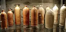 The Kannenbäckerland was described as such in the late 18th century, although the records show that pottery had been continuously made here since at least 1402.[3] The surrounding regions and areas referred to the occupation of potter (normally Töpfer in German) either as Dippemacher (in Hessian) Döppesbäcker (in the area of Cologne) or Töpfer and Hafner (in the Palatine dialect). They were only called Kannenbäcker (or Kannebäcker) in a relatively small area south of Cologne and in the southern Westerwald.[4] Traditionally the "Kannebäckerland" supplied the Frankfurt region upstream on the Rhine with Apfelwein Bembel, a grey earthenware jug with bule decoration for serving apple cider. Down the Rhine in the Netherlands, clay pots in the classic blue décor were known as Keulse pot ("Cologne Pots").[5] The Mosellen vintners, when working in the vineyard, had their daily wine or Fluppes ration in brown Bimmes (see photograph).