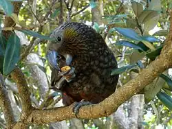 The island is home to a number of native bird species, mostly re-introduced. These include the takahē, North Island kōkako, brown teal (pāteke), stitchbird (hihi), North Island saddleback (tīeke), tomtit (miromiro), fantail (piwakawaka), morepork (ruru), North Island robin (toutouwai) and a hybrid population of North Island and western weka. Five little spotted kiwi were translocated from the South Island to Kapiti Island in 1912.[31] There are currently 1,200 little spotted kiwi on Kapiti Island, which until recently were thought extinct on the mainland.[32][33] On 12 October 1912, three kākāpō were released on Kapiti Island.[33] Rat eradication has led to increases in red-fronted parakeets, North Island robins, bellbirds, and saddlebacks. The island is considered one of New Zealand's most important sites for bird recovery, and a breeding site for seabirds such as the sooty shearwater (tītī). However, sooty shearwaters have been under threat on the island because of predation by weka.[34] Other birds that use the island for breeding include the spotted shag.[35]