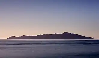 Kapiti Island ([kɑːpiti]), sometimes written as Kāpiti Island,[1] is an island nature reserve located 5.6 km (3 mi) off the west coast of the lower North Island of New Zealand and within the Kāpiti Coast District. Parts of the island were previously farmed, but it is now a predator-free sanctuary for endemic birds, including many endangered birds. The island is 10 km (6.2 mi) long, running southwest/northeast, and roughly 2 km (1.2 mi) wide, being more or less rectangular in shape, and has an area of 19.65 km2 (7.59 sq mi).