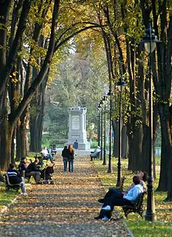 After the monument was erected, it was suggested that the park should be planted around it. City officials dismissed the idea, citing lack of necessary funds.[2] One of the first avenues in Belgrade was planted along the Kragujevac Road (modern Liberation Boulevard), in 1848, from which the park developed in time. The planted seedlings were of chestnut trees, and the chestnut alley descending from the original one still survives in the park.[3] By 1887, the cemetery and monument became neglected.[2]