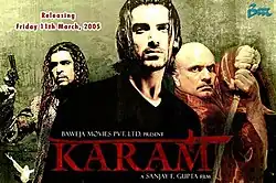 Karam was released theatrically on 11 March 2005, opening to mixed reviews from critics and audiences.[6] It was a commercial failure both domestically and overseas.[7][8] In 2011 during an interview for his film Force, John Abraham revealed a number of people came up and told him Karam was their favorite film.[9]
