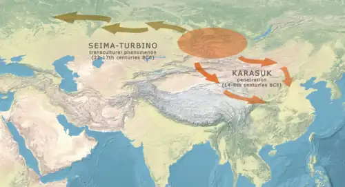 - ^ Chernykh 2008, p. 90: "The East Asian Metallurgical Province [EasAsMP]. (...) As mentioned above, the EasAsMP’s earliest phase was associated with the striking Seima-Turbino transcultural phenomenon, and subsequently it seems to continue the Seima-Turbino traditions of metallurgy and metal processing. The most important materials characteristic of the early EasAsMP come from burials of the widely known Karasuk cultures (Chlenova 1972; Chernykh 1992: 264-271) (13). The numerous metal finds come from graves, most of which have been destroyed by recent tillage."