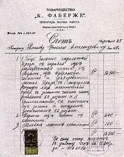 The Birch Egg was created in 1917, and was due to be completed and delivered to the Tsar that Easter, as a present for his mother, the Empress Maria Feodorovna. Before the egg was delivered however, the February Revolution took place and Nicholas II was forced to abdicate on March 15.[1] On April 25, Fabergé sent the Tsar an invoice for the egg, addressing Nicholas II not as "Czar of all the Russias" but as "Mr. Romanov, Nikolai Aleksandrovich".[2][1] Nicholas paid 12,500 rubles and the egg was sent to Grand Duke Michael Alexandrovich at his palace, for presentation to the Empress, but the Duke fled before it arrived. The egg remained in the palace until it was looted in the wake of the October Revolution later that year.[1]