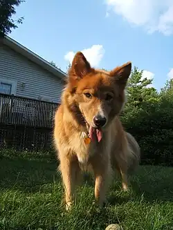 Since the renaming of the Karelo-Finnish Laika there has been a very slight divergence from the Finnish Spitz, whilst the Finnish Spitz is only solid red in colour, the Karelo-Finnish Laika can also be fawn or black and can have white markings on the head, chest, legs and tail.[1] The breed has a very fox-like head, a heavy protective coat and a distinctive spitz curled tail, it is described as cheerful, energetic and always eager to please its human handlers.[1]