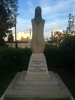 The garden was initially referred to simply as il-gnien (the garden) for some time, before being named the Karin Grech Playing Field (Ġnien Karin Grech).[4] The garden was named after Karin Maria Grech, a victim of a letter bomb attack. The main feature of the garden is the monument of Karin Grech that is a commemoration monument of her being a victim in a political crisis concerning her father Edwin Grech, an obstetrician and gynaecologist at the time of the 1977 doctors' strike[7][8]