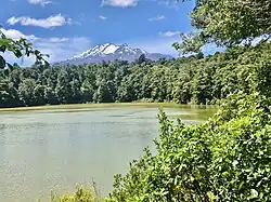 To the north of the station,[17] Lake Rotokura and Dry Lake are maar crater lakes.[18][19] A half hour walk from the station leads to the lake. It remains surrounded by beech forest, in which tūī, kākā, korimako, pīwakawaka and toutouwai are commonly seen.[20] Mistletoe is being monitored in the area.[21]