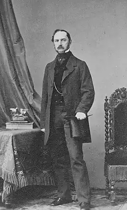 During the Schleswig–Holstein question, Duke Charles was a supporter of the Schleswig–Holstein movement. In 1846, as head of the House of Glücksburg, he protested against King Christian VIII's open letter on the succession in the duchies of Schleswig and Holstein, and out of dissatisfaction resigned from the Army in August of the same year.[5] Nevertheless, eight days after his accession to the throne, King Frederick VII gave him the rank of major general.[6] Duke Karl actively sided against Denmark during the First Schleswig War from 1848 to 1851, which caused the ducal couple's relations with the Danish Royal family to be severed. During the war, he initially took command of one of the provisional Schleswig-Holstein government's Infantry Brigades, but already in the autumn of 1848, he and his wife moved to Dresden in the Kingdom of Saxony.[5] There they resided until 1852, when they returned to Denmark after am uneasy reconciliation was established.[6] As a result of his rebellion against the Danish government, Duke Carl lost his Danish orders and decorations and only had them restored in 1856.[5] Also, in 1854, he had to cede the family seat Glücksburg Castle to King Frederick VII of Denmark who used the castle as his summer residence and also died there in 1863.[7]