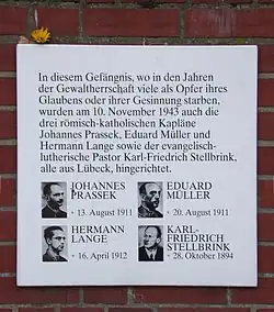 In 1941, while serving as a pastor in Lübeck, he met Johannes Prassek, a Catholic priest from the nearby Sacred Heart Catholic Church (de). They shared their disapproval of the Nazi regime, and Prassek introduced Stellbrink to his Catholic colleagues, Frs Hermann Lange and Eduard Mueller. The four priests spoke publicly against the Nazis – initially discreetly – distributing pamphlets to friends and congregants.[4] They copied and distributed the anti-Nazi sermons of the Catholic Bishop Clemens August von Galen of Münster.[1] Then, following the RAF air raid on the city, after which Stellbrink tended wounded, he delivered a Palm Sunday sermon which attributed the bombing to divine punishment. Stellbrink was arrested, followed by the three Catholic priests. He was sentenced to death by the People’s Court on 23 June 1943, and executed in Hamburg on 10 November 1943, along with the three Catholics.[2] The mingling of the blood of the four guillotined martyrs has become a symbol of German Ecumenism.[4] After his death, Stellbrink's widow was billed for his court costs, imprisonment, and execution.[5]