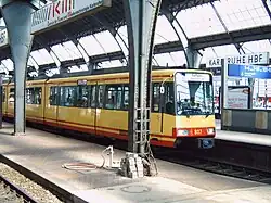 Karlsruhe station is a hub for S-Bahn train services of the Karlsruhe Stadtbahn of the Albtal-Verkehrs-Gesellschaft. Most of the Karlsruhe Stadtbahn services, however, use platforms A to D on the station forecourt (officially: Bahnhofplatz), which is shared with urban trams and buses.