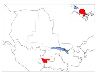 Karmana District (Uzbek: Karmana tumani, before 2003: Navoiy District)[1] is a district of Navoiy Region in Uzbekistan. The capital lies at the town Karmana.[2] It has an area of 950 km2 (370 sq mi)[3] and its population is 128,200 (2021 est.).[4] The district consists of 5 urban-type settlements (Karmana, Malikrabot, Paxtaobod, Podkoron, Kamolot, Yoshlik) and 7 rural communities (Uyrot, Doʻrmon, Narpay, Xazora, Yangiariq, Jaloyir).[2]