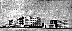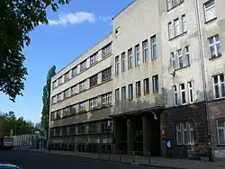 In August 1939, the construction of a modernist building at 7 Karol Anstadt Avenue was completed. This building was intended to house the Men's Gymnasium of the Jewish Secondary School Society in Łódź, with classes scheduled to begin on 1 September 1939.[23] However, following the German occupation of the city, the building was seized by the Nazis on 9 September 1939. The next day, the 2nd unit of the III Special Operational Group of the Security Police (Einsatzgruppe III Sicherheitspolizei), commanded by SS-Sturmbannführer Fritz Liphardt, arrived in Łódź and was stationed in the school building. On 7 November 1939, the building was converted into a local Gestapo office, with Gerhard Flesch serving as its first head (later succeeded by Robert Schefe and Otto Bradfisch). The basement was converted into a detention center, and garages and storage facilities were set up on the adjacent plot along Północna Street. The Gestapo personnel (who numbered 151 officers in the summer of 1944) resided in nearby buildings.[24][25][26] The access to the avenue was blocked on both sides by German checkpoints.[27] In 1944, Jan Lipsz, codenamed Anatol, a baker from Zduńska Wola and a member of the Union of Armed Struggle, was likely executed during an investigation at the Gestapo headquarters.[28] The Gestapo office remained operational until the end of the German occupation of the city, and a commemorative plaque now adorns the front wall of the building in remembrance of these events.[25]