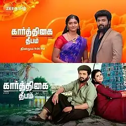 Karthigai Deepam is a 2022 Indian Tamil language television series having two seasons. The first season of the series starred Arthika and Karthik Raj (both in the titular role)[2][3] and Arthika played in a dual role.[4][5] It premiered on Zee Tamil from 5 December 2022 and ended on 9 November 2024.[6][7] The storyline of the serial is taken from Zee Bangla's TV series Krishnakoli however it has a different narration.