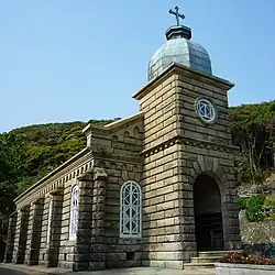 Kashiragashima Church is a stone church built in the Romanesque style. It was constructed out of sandstone quarried on Kashiragashima[6][10] and its architect was Yosuke Tetsukawa, who was nicknamed "the father of church architecture" due to the many churches he designed around Japan.[11] It was built using the technique of rustication[12] and is the only stone church in Nagasaki Prefecture.[13] The church's exterior features stained glass windows and its ceiling's feature floral patterns inspired by the Goto camellia.[14]