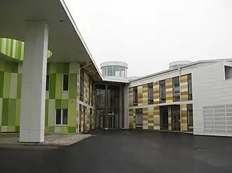 The construction costs of the community centre were around 42 million euros total with a Public-private partnership (PPP) of 25 years with the construction firm Lemminkäinen.[1] The building lies on a seven hectare property and its total area is around 23 000 gross square metres (35 650 071.3 square feet) and floor area measured at 24 588 square metres (264 663.029 square feet).[2] Construction on the community centre began in 2012 and was completed in 2014 when it was handed over for the city's operations and inauguration for the building was held later that year in November. The PPP with the city and the construction firm which includes the maintenance of the building is valid until 2039 and the deals total value is around 86 million euros. The bearing structures of the building are made out of concrete elements and exterior walls from wooden elements with colorful cement bonded fiberboards on top. Parking spaces include 200 parking spots for motor vehicles and 900 bicycle stand spots.