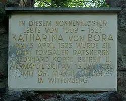 Her father sent five-year-old von Bora to a Benedictine convent in Brehna in 1504 to be educated, according to a letter Laurentius Zoch sent to Martin Luther in 1531.[10] At the age of nine, she was moved to Nimbschen Abbey, Cistercian community named Marienthron ('Mary's Throne') near Grimma, where her maternal aunt was a nun.[11] Von Bora's presence is in the financial accounts of 1509/10.[12]