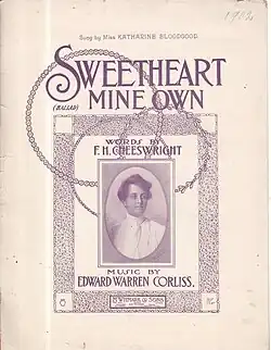 After her divorce, she was often featured on programs that included a wide range of performance genres.[7] "She has decided to stay in the vaudeville field, at least for a time, as she finds it much more lucrative than the concert field," explained a San Francisco magazine.[8] In 1904 Bloodgood appeared on a vaudeville bill with Blind Tom Wiggins at an opera house in Rochester, New York, just months before Wiggins's health ended his long performing career.[9] In 1906, she was "the artistic number" on a Washington, D.C., variety program that included acrobats, comedians, and trained animals.[10]