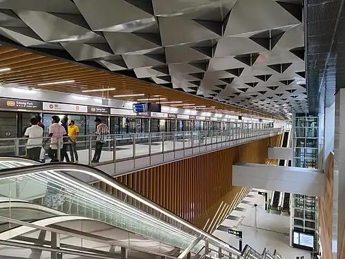 The station has a stacked platform layout,[21] and has a depth of 26.8 metres (88 ft).[1] The upper concourse of the station is naturally illuminated by large skylights.[1] Like the other TEL4 stations, hybrid cooling fans at the platform complement the station's air-conditioning to improve air circulation yet lower energy consumption.[22]