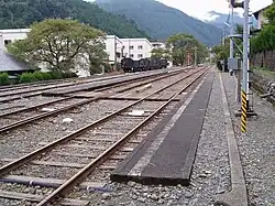 The station has a single side platform joined to an island platform by a level crossing. Only two tracks are in regular use, with the track on the far side of the island platform and a shunt track used for maintenance and for freight services. The small station building is staffed.