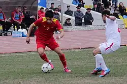 Sharipov (left) in action during the 2014 AFC Challenge Cup qualification match against Tajikistan | |||