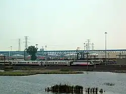 Portion of the Morris Canal ran through Kearny Point, unused portions which remain today.[25] The peninsula is crisscrossed with rail passenger and freight rail lines,[9][26] including those of Amtrak, New Jersey Transit, and PATH, the last of which maintains a station at Harrison (Amtrak and NJT having ceased service there). Also in this area was the former Manhattan Transfer. The Kearny Connection and Waterfront Connection are major passenger rail junctions. The proposed high-speed rail line known as the Gateway Project will traverse the area and includes the replacement of the Portal Bridge and the Sawtooth Bridges.