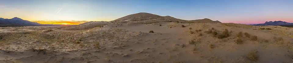 Kelso Dunes, also known as the Kelso Dune Field, is the largest field of aeolian sand deposits in the Mojave Desert. The region is protected by the Mojave National Preserve and is located near the town of Baker, San Bernardino County, California, and the Preserve Visitor Center.[2] The dune field covers 45 square miles (120 km2) and includes migrating dunes, vegetation-stabilized dunes, sand sheets, and sand ramps. The tallest dunes rise up to 650 feet (200 m) above the surrounding terrain.