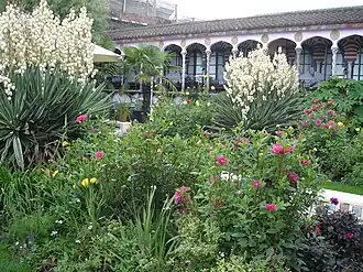 - a Spanish garden, in a Moorish style based upon the Alhambra in Spain, with fountains, vine-covered walkways and Chusan palms;
