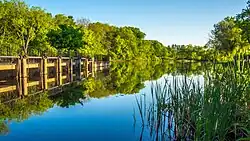 The Grand River runs through the county. On its west bank are burial mounds, remnants of the Hopewell Indians who lived there.[5] In the 18th century the Odawa migrated to this area and established multiple villages along the Grand River valley.[6] By the 19th century there were estimated to be over 1000 Odawa.[6][7] The fur trade became an important industry in the valley during the early 19th century. After the War of 1812, Rix Robinson and Louis Campau were the earliest traders in the area.[8] In 1826, Campau established a trading post in Grand Rapids. In 1831, he bought land and platted the town. Campau is considered the town's "father".[9][10][11] One year later, government surveyor Lucius Lyon purchased land north of Campau's property. Campau surveyed and platted the village following Native American trails[10] and Lyon had platted his property in an English grid format, which meant there were two adjoining villages, with different platting formats.[10] Campau later merged the villages under the name of Grand Rapids.[10]