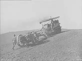 134th Siege Battery, RGA, was formed at Dover on 3 May 1916 with a nucleus of Territorials drawn from the Kent and Sussex RGA units.[44][47] The battery was equipped with four modern 6-inch 26 cwt howitzers and was sent to the Macedonian front, arriving at Salonika on 20 August 1916. It served with XII Corps in the Vardar and Struma valleys.[46][48] In 1917 it fought in the Second Battle of Doiran, but was then moved to the Palestine Front, where it fought with XXI Corps in the Third Battle of Gaza, the capture of Jerusalem and the victorious Battle of Megiddo.[46][49][50] 134th Siege Battery was disbanded in 1919.[44]