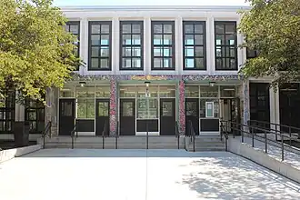 Construction on the school began in March 1968. At $7.4 million, it was considered Chicago's most expensive high school at the time.[9] The new school, situated at 5015 South Blackstone Avenue, opened in September 1969 with an enrollment of 700. The school's demographics during the first ten years was made up of 79% African-American and 21% White. The white population at the school continue to decline over the years, bringing the current demographics to 84% African-American, 5% white, 4% Hispanic, 3% Asian, and 4% multi-racial or other.[10] Elizabeth Mollahan-Jochner, who had been the principal of Kenwood Upper Grade Center, served as the new Kenwood's principal, holding the position for 18 years from the school's opening until her retirement in June 1987.[11][12] In recognition of the school's academic excellence and special programs, the Chicago Board of Education and CPS designated the school an "academy" and " a school of distinction" in 1977.[13]