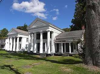 Kenyon Residences, also known as Twin Sisters, is a pair of historic home and located at Mt. Vision in Otsego County, New York. They are a pair of Greek Revival style 2-story, wood-frame dwellings. They both have temple form facades characterized by Doric order columns supporting over scaled, elaborately embellished pediments. The house at 62 Main St. was built between 1839 and 1851. The main block of the house at 60 Main St. was also built between 1839 and 1851, with a three-room, 1+1⁄2-story wing added about 1859. Also on the property is a shed.[2]