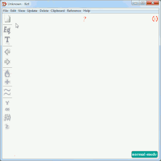 Ket is a modal editor which means that it changes how it displays information and how the user interacts with it depending on the mode it's in. By default, keyboard commands perform specific selection or transformation commands such as to delete the current selection, 'x'. Some commands must be followed with a direction, for example paste, 'p'. Other commands require a block of text such as to replace the selection with an equation fragment, 'r'. Editing lines of text The editor displays a list of lines of either text, equations, images or plots. In order to edit text, <Ctrl-r> starts editing text while <Esc> or <Ctrl-c> stops. Here <Enter> takes a new line and continues editing text.