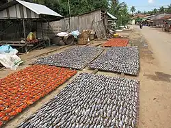 Prahok is used as flavouring for almost every Khmer dish, mixed with rice or served as a dipping sauce (ទឹកជ្រលក់, tœ̆k chrôluŏk).[19] It can also be prepared into dishes of its own, such as prahok k'tis (ប្រហុកខ្ទិះ, prâhŏk khtih), prahok kap (ប្រហុកកប់, prâhŏk káp), teuk khreung, teuk prahok[57] prahok ang (ប្រហុកអាំង, prâhŏk ăng), and prahok chien (ប្រហុកចៀន, prâhŏk chiĕn). Fermented roe (ពងត្រី, pông trei) is primarily eaten with steamed eggs, omelettes, and other hen or duck egg dishes.[57] Kapi is often mixed with sugar, garlic, lime juice, chili, and crushed peanuts and used as a dipping sauce for vegetables, fruit, meat, and fish.[60]