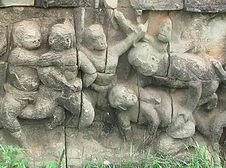 Khmer traditional wrestling (Khmer: បោកចំបាប់ - Baok Cham Bab) is a folk wrestling style from Cambodia. It has been practiced as far back as the Angkor period and is depicted on the bas-reliefs of certain temples. The earliest form of Khmer traditional wrestling was called Maloyuth. Maloyuth was created in 788 A.D. by Brahmin Timu.[1] It evolved to the current form of wrestling, Cham Bab, in the 8th century. Although predominantly a male sport today, Khmer wrestling was once practiced by both sexes as female wrestlers are also displayed on the Banteay Srei temple.