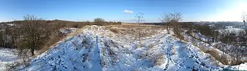 The hillfort adjoins the southern part of Kyiv, namely Feofaniya Park. It occupies a rhombic plateau 1000x700 m wide, bordered by valleys of the streams. All the plateau area, 31 ha, was surrounded with earth rampart, while the slope of the hill was fortified by a scarp with a berm and a moat beneath.[1] The rampart, scarp and berm are well preserved on the western and eastern edges, and remains of the moat are much less conspicuous now. It is supposed that the hillfort had 3 entrances: in the northern, eastern and southern part of the rampart.[2]