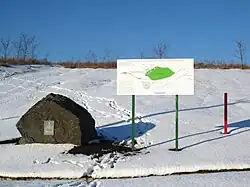 In 2016, Institute of Archaeology of Ukrainian Academy of Sciences prepared one more documentation of the hillfort, where protected area includes almost 20 ha. It comprises the 16.5 ha from 2007 scheme plus the western border of the plateau with the rampart and scarp. Additionally, part of a buried erosion zone is included. In the same year, new borders were approved by Khotiv village council[34][35] and marked by red concrete pillars. Three stones with commemorative plaques and an information board were installed on the hillfort as well. Area of the archaeological monument stated on the board is 18.3 ha, and area of its protection zone (a strip along its western edge) is 1.04 ha. It excludes all the northern, southern and eastern parts of the hillfort (the latter still having a well-preserved rampart and scarp). The rest of the hillfort is planned for museumification.[36]