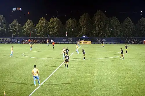In 1875, it was forbidden to score a goal directly from the kick-off.[33] This restriction was reversed in 1997, when it was permitted once again to score a goal directly from the kick-off.[34] In 2016, at the same time the backwards kick-off was legalized, the possibility of scoring an own goal directly from the kick-off (an extremely unlikely situation) was removed, with a corner kick being awarded to the opponents instead.[35]