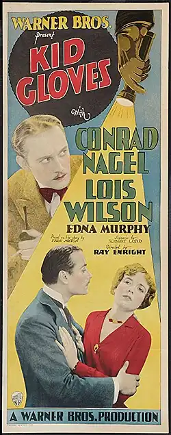 Kid Gloves is a 1929 American sound part-talkie pre-Code drama film directed by Ray Enright, and starring Conrad Nagel, Lois Wilson, Edward Earle, Edna Murphy, and Maude Turner Gordon. In addition to sequences with audible dialogue or talking sequences, the film features a synchronized musical score and sound effects along with English intertitles. According to the film review in Harrison's Reports, 75 percent of the total running time featured dialogue. [1] The soundtrack was recorded using the Vitaphone sound-on-disc system. The film was released by Warner Bros. on March 23, 1929.[2][3][4]