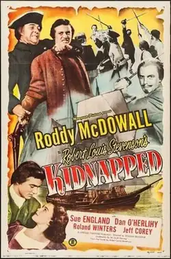 Kidnapped is a 1948 American historical adventure film directed by William Beaudine and starring Roddy McDowall, Sue England and Dan O'Herlihy. It is based on the 1886 novel of the same name by Robert Louis Stevenson. The former child star McDowall plays David Balfour in the story about a young man cheated out of his birthright by his wicked, covetous uncle Ebenezer (Houseley Stevenson).[1]